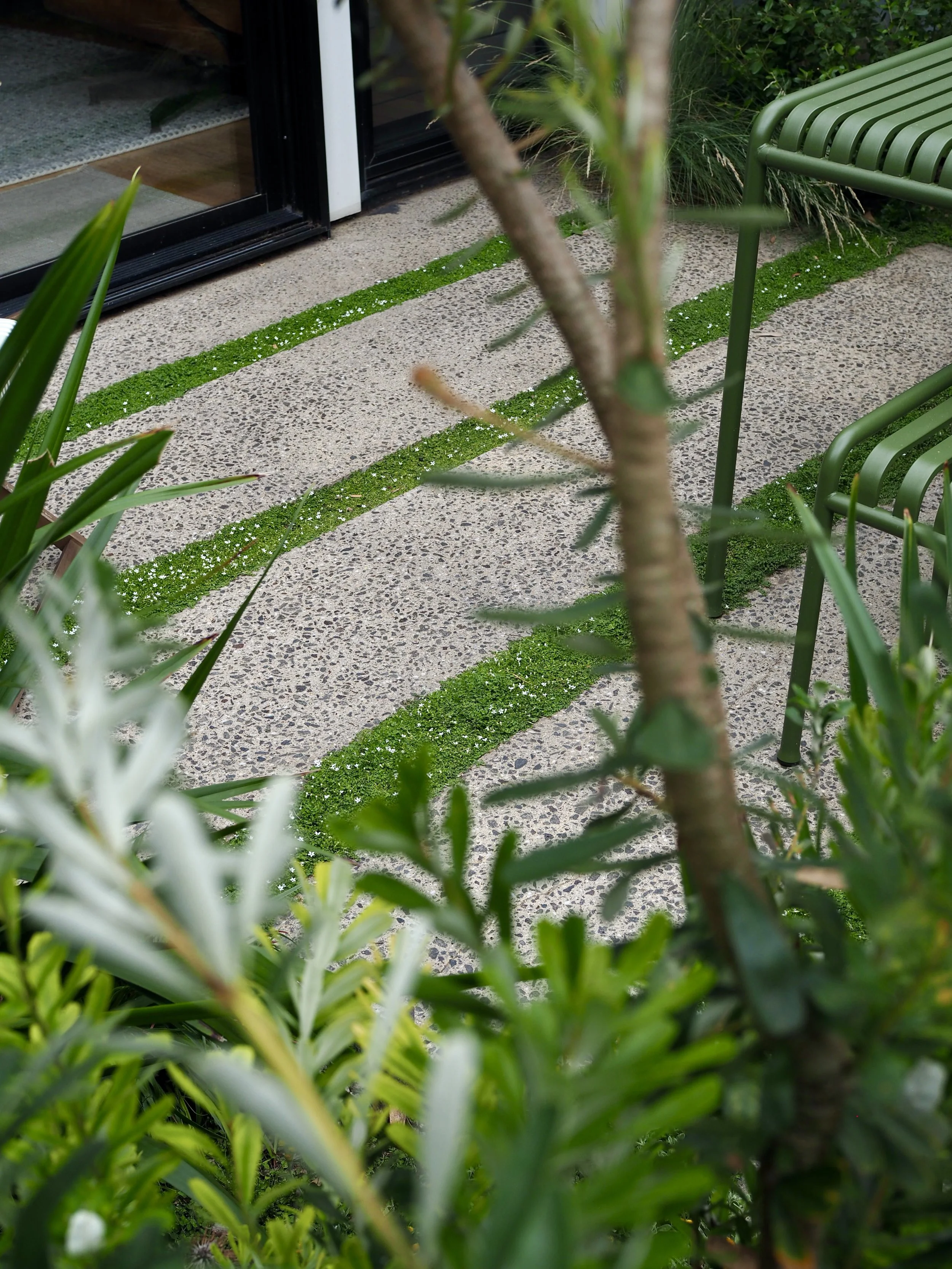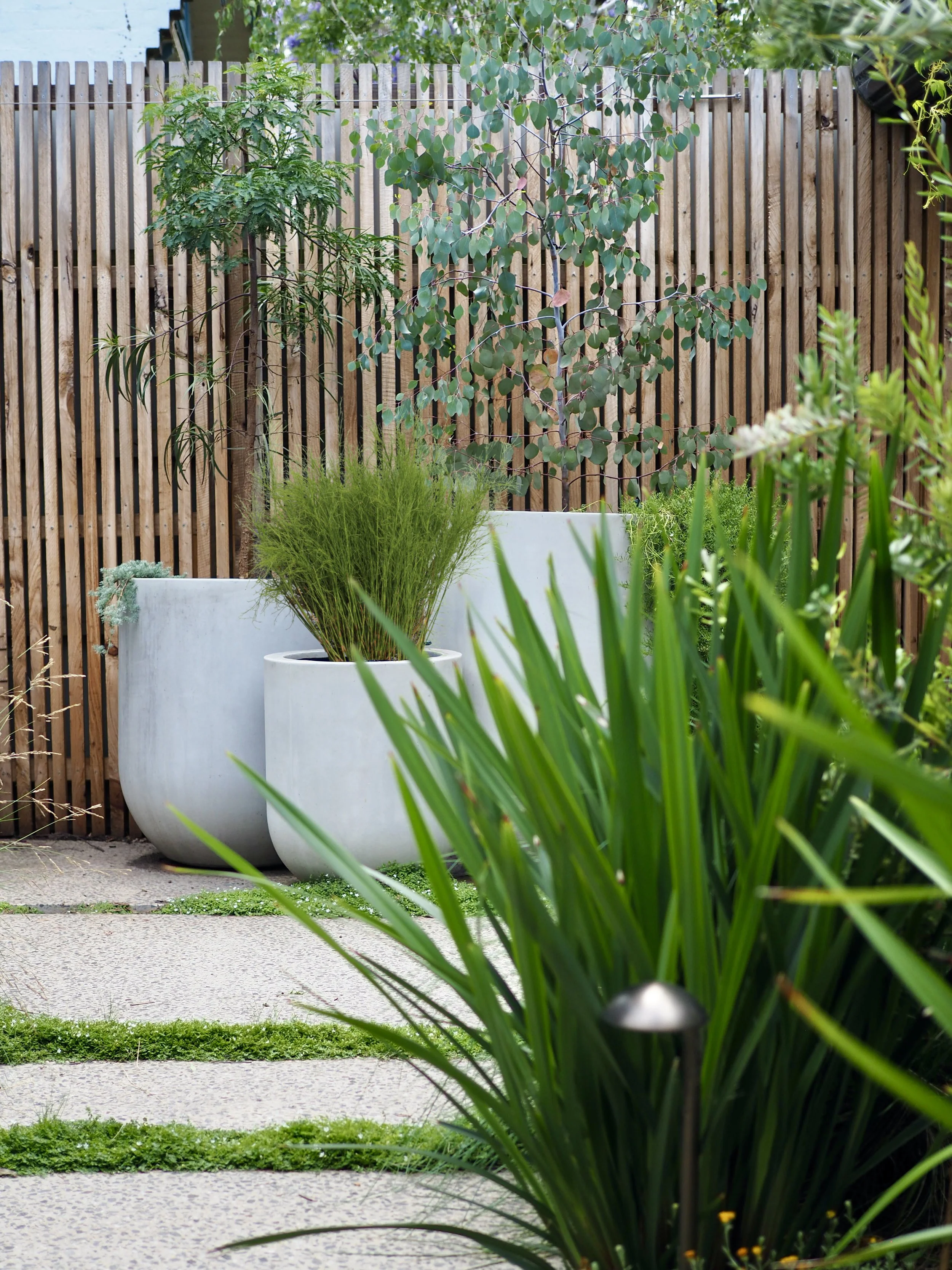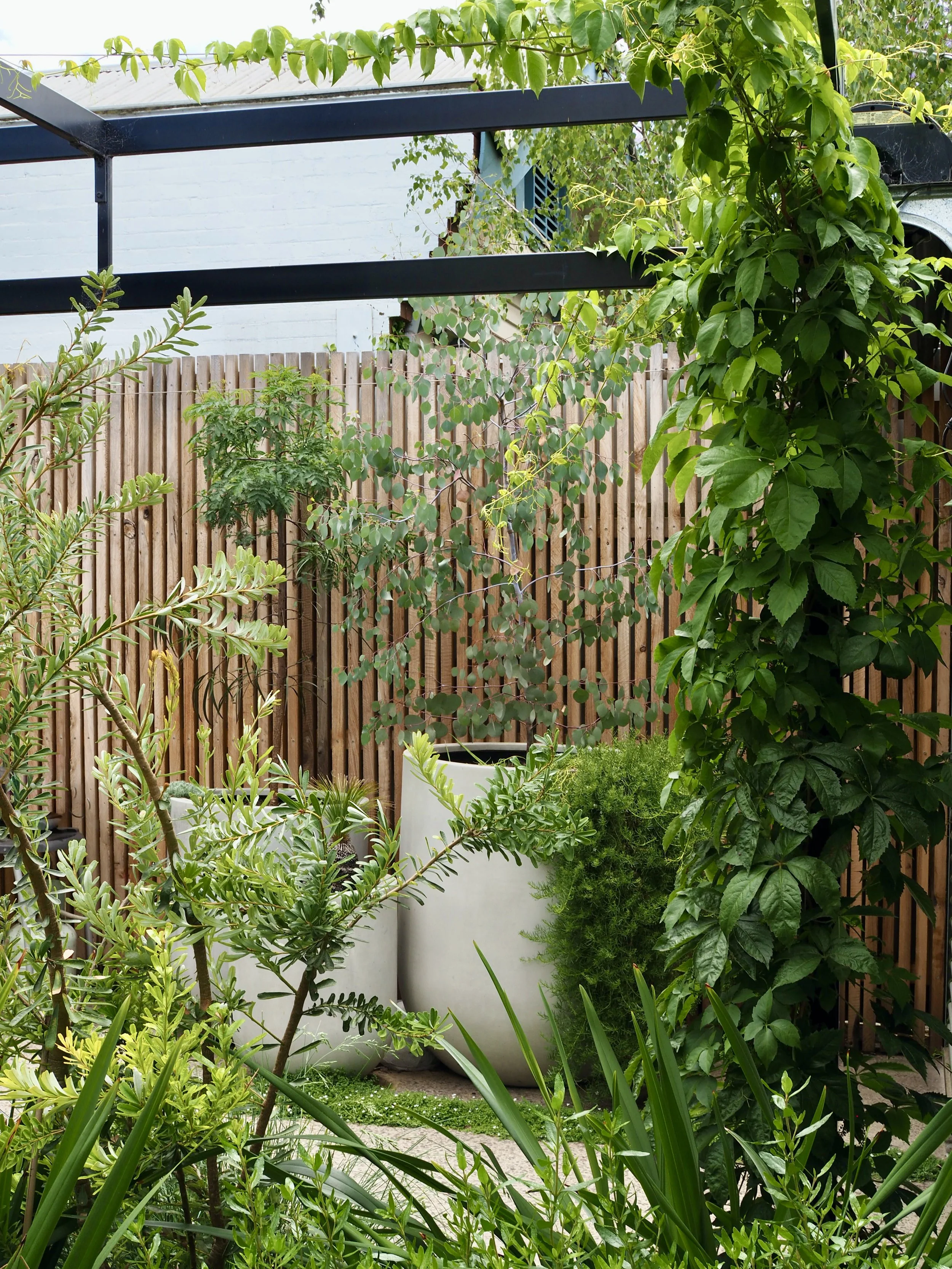 Materials & Plants: Reclaimed Concrete / Ceres Fair Wood Timber Battens / Steel Pergola / Trailing Pratia / Flowering Gum / Silver Banksia / Trigger Plant