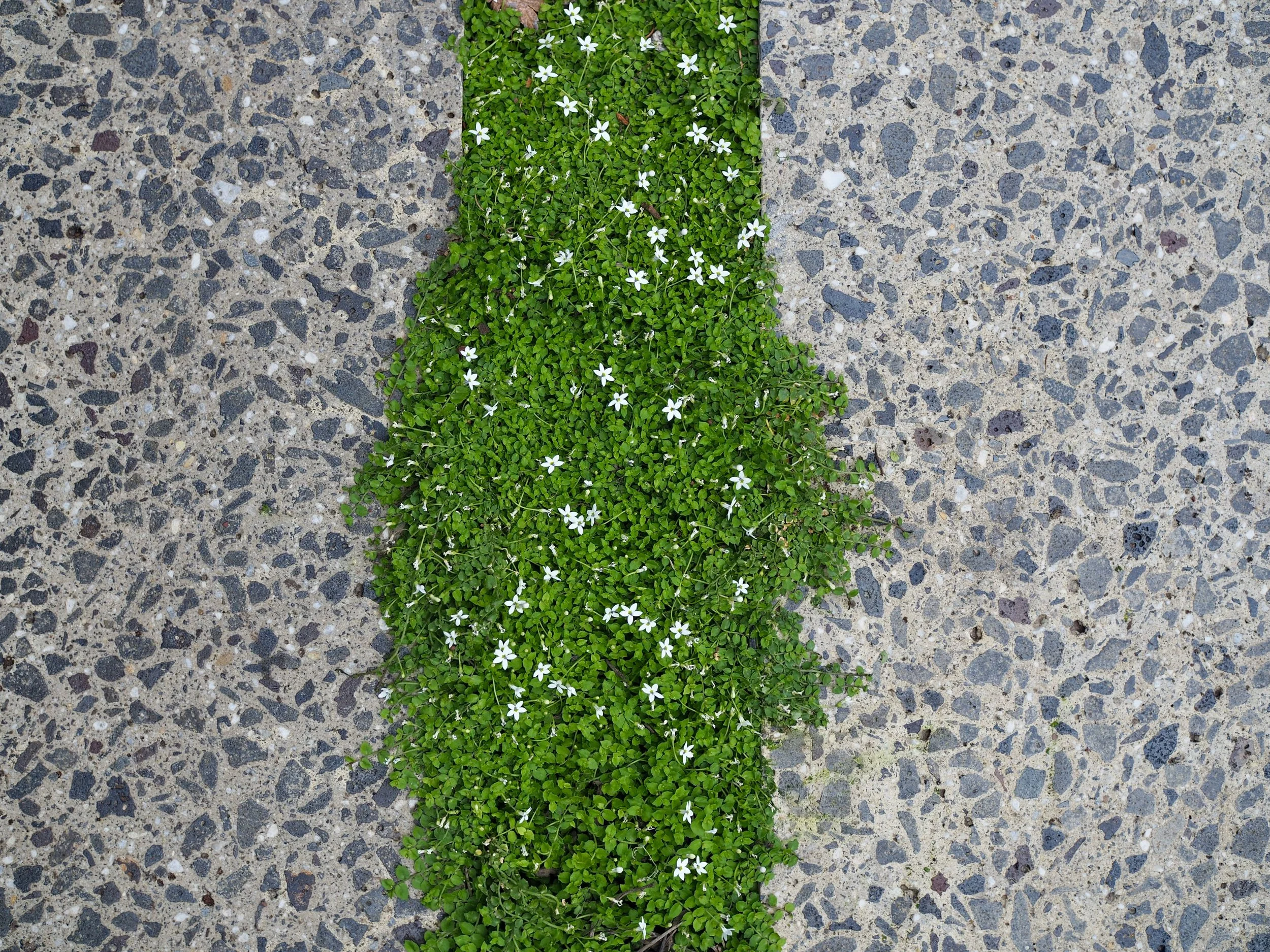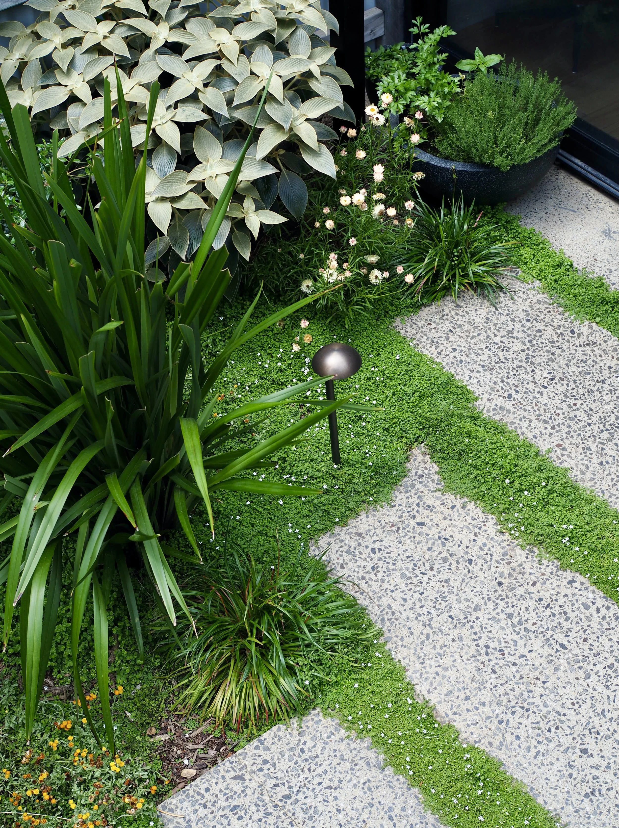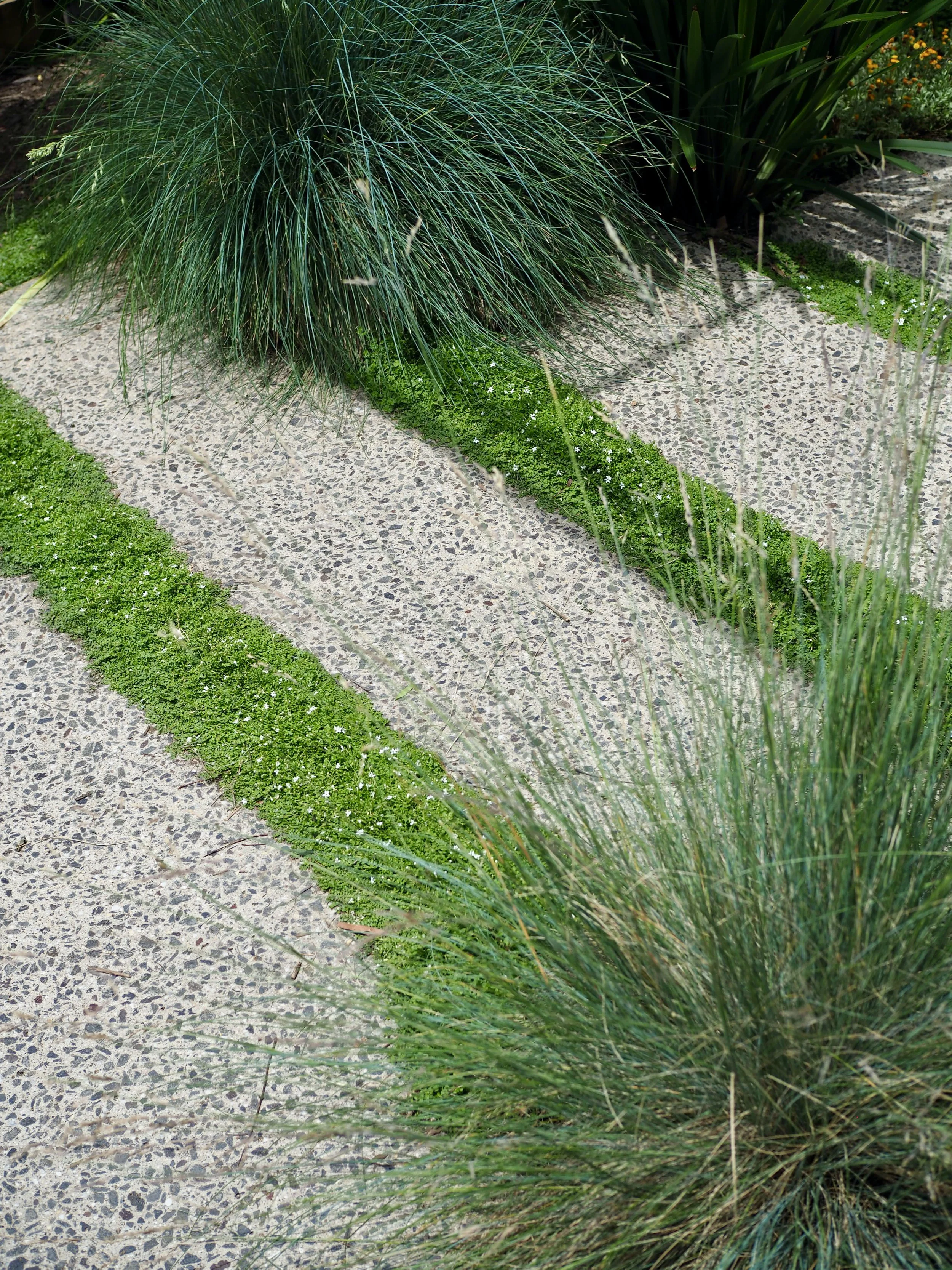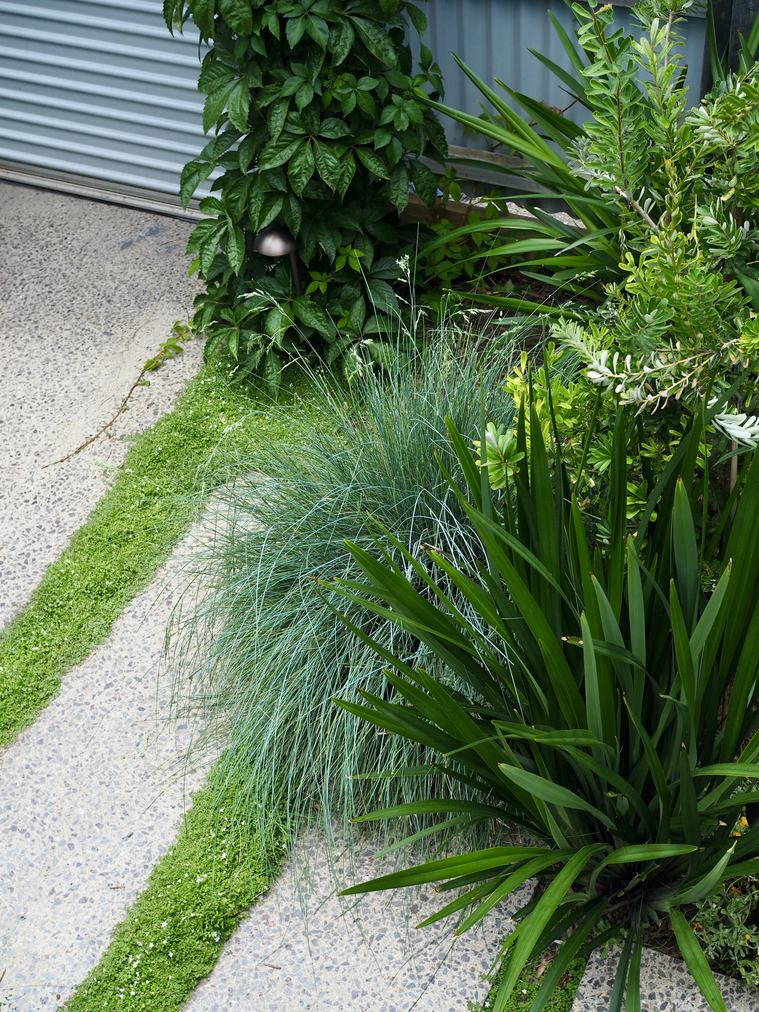 Materials & Plants: Reclaimed Concrete / Ceres Fair Wood Timber Battens / Steel Pergola / Trailing Pratia / Flowering Gum / Silver Banksia / Trigger Plant